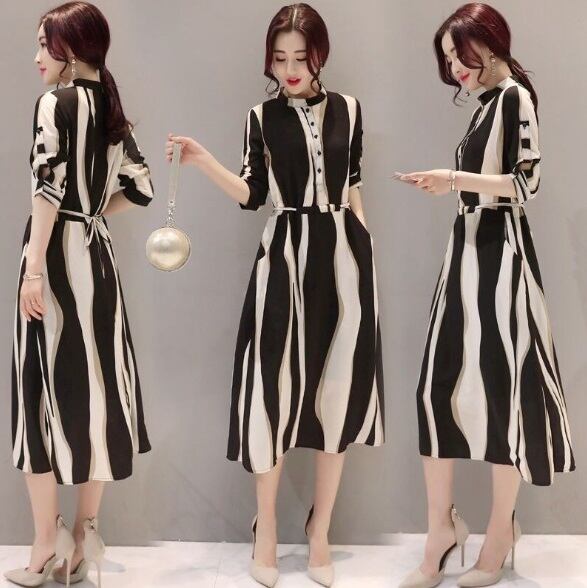 シフォン エレガント ストライプ ワンピース ミモレ丈