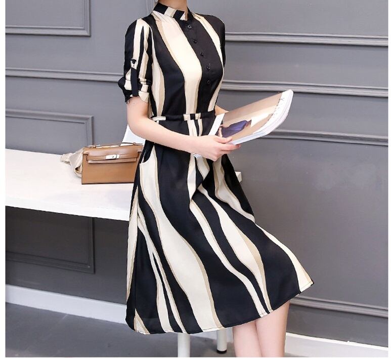 シンプル ストライプ柄 シフォン エレガント ミモレ丈 ドレスワンピース