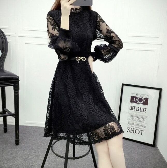 総レース パーティードレス パフスリーブ ベルト付き