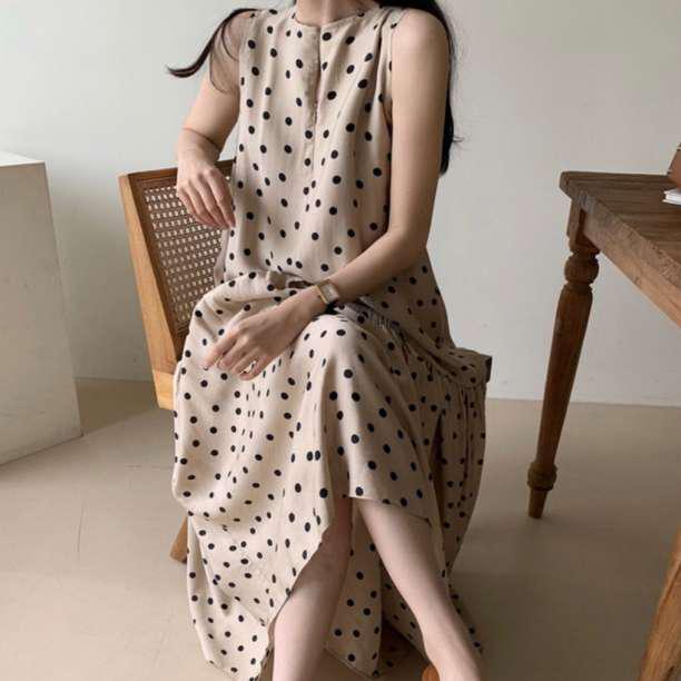 ロング ドット柄 ワンピース ノースリーブ レディース