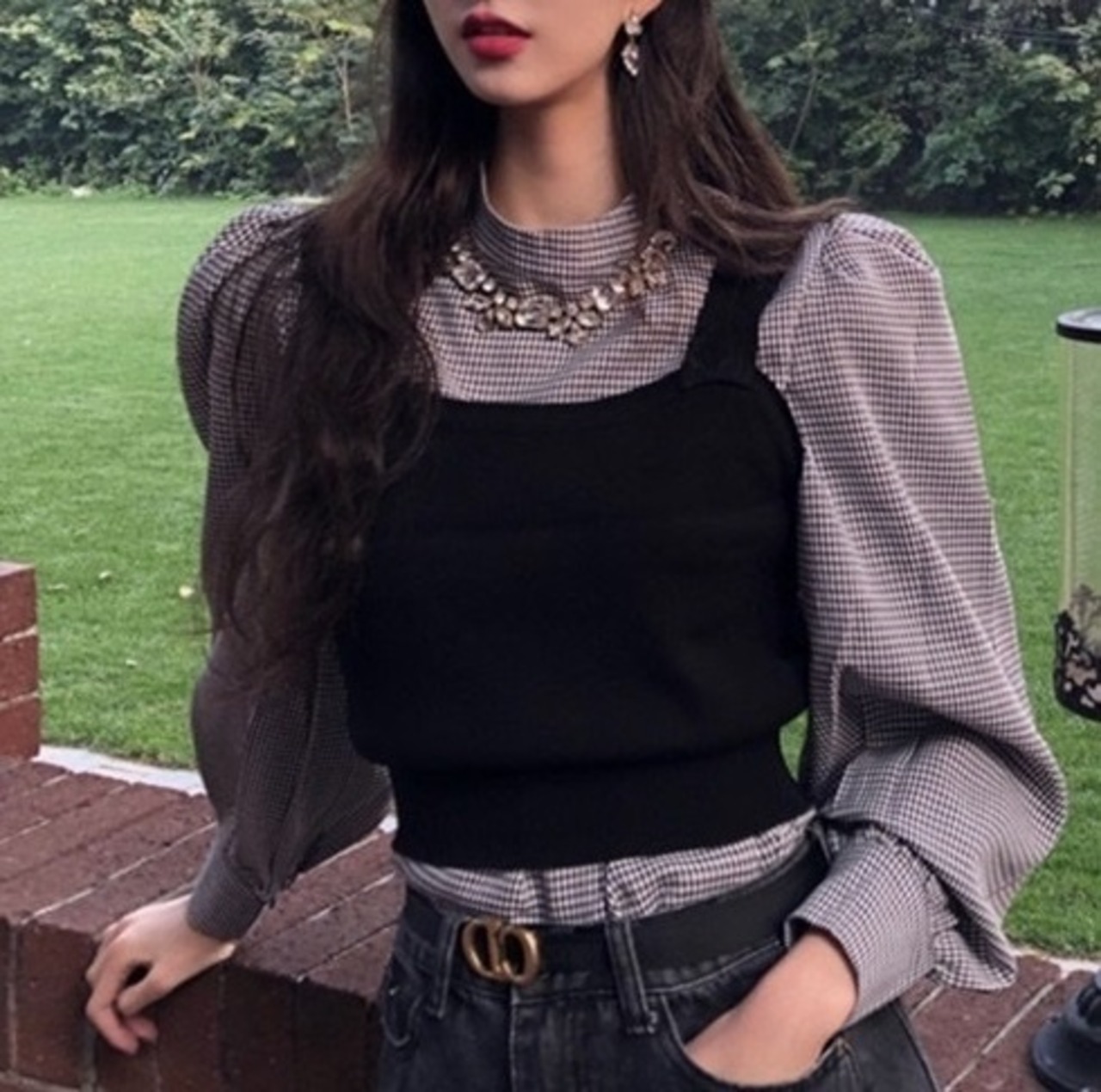2点セット♪ チェック ブラウス ビスチェ ブラック