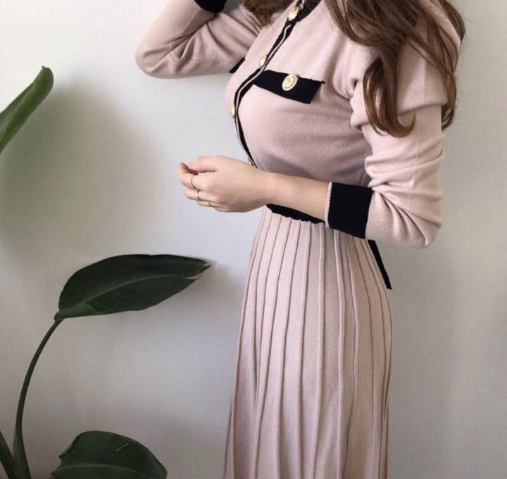 リボンベルト付き ロング ワンピース プリーツ ピンク 韓国