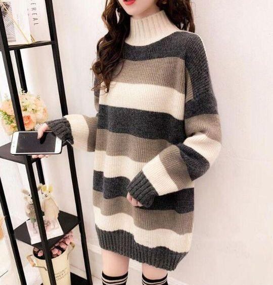 ハイネック 韓国 タートルネックボーダーニット ダークカラーのマルチボーダーニットです。