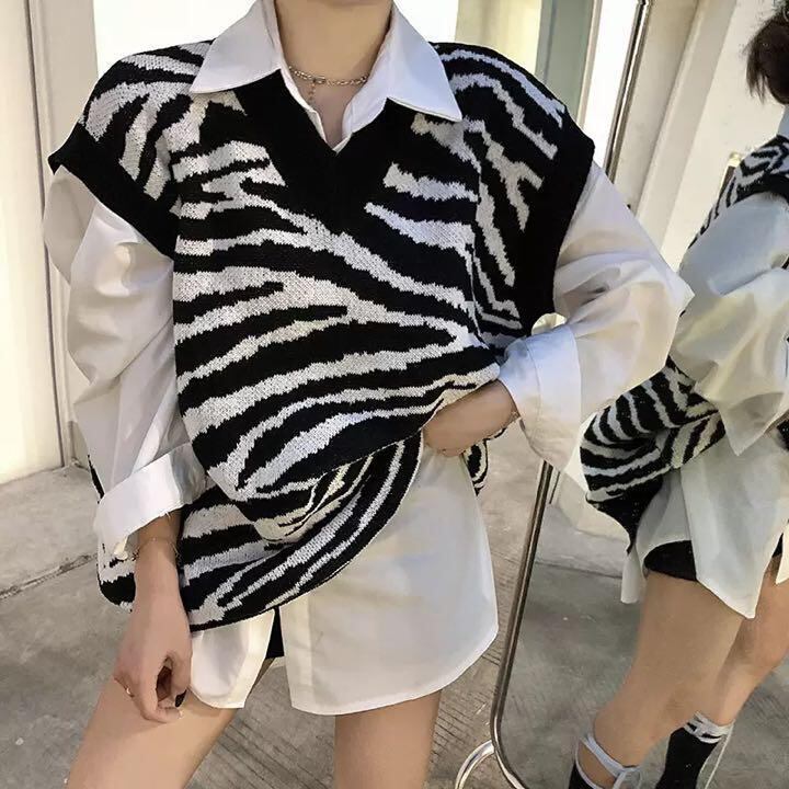 ゼブラ柄 Vフロント ニット ベスト ノースリーブ トップス シャツ ブラウス 韓国